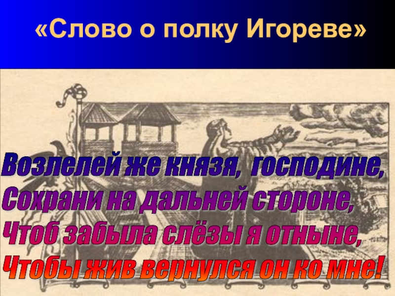 «Слово о полку Игореве»Возлелей же князя, господине,  Сохрани на дальней стороне,  Чтоб забыла слёзы я