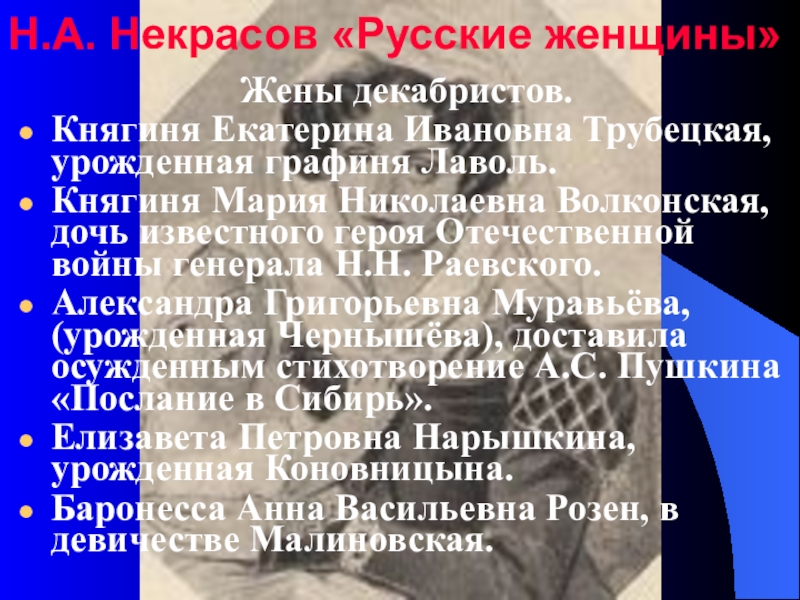 Н.А. Некрасов «Русские женщины»Жены декабристов.Княгиня Екатерина Ивановна Трубецкая, урожденная графиня Лаволь.Княгиня Мария Николаевна Волконская, дочь известного героя