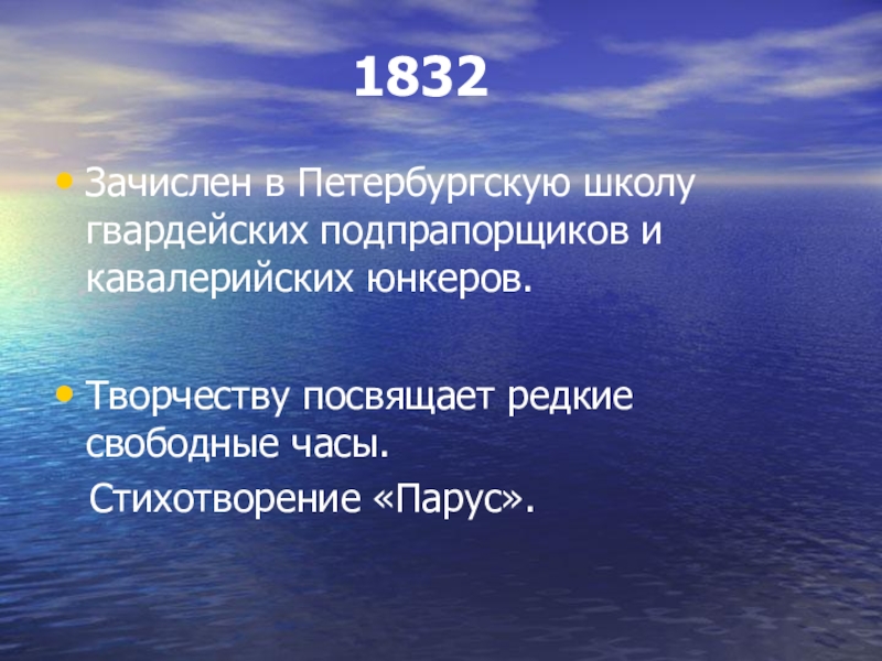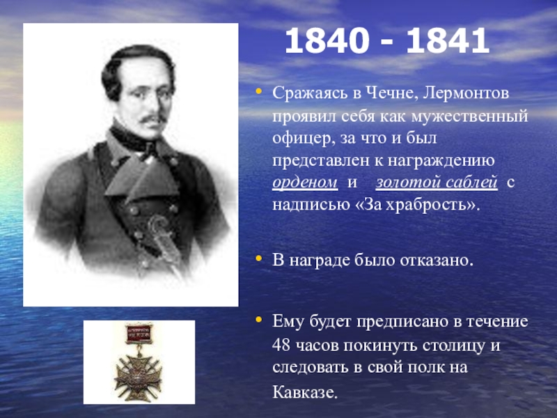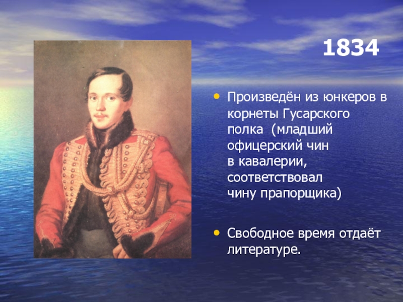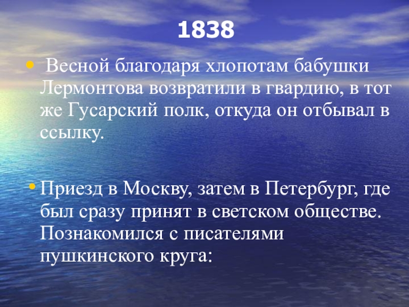 Весной благодаря хлопотам бабушки Лермонтова возвратили в гвардию, в тот же Гусарский полк, откуда он отбывал в ссылку.