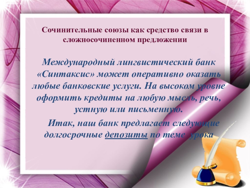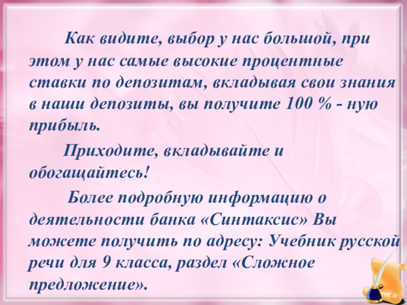 Это сайт презентаций, где можно хранить и обмениваться своими презентациями, докладами, проектами, шаблонами в формате PowerPoint с другими пользователями. Мы помогаем школьникам, студентам, учителям, преподавателям хранить и обмениваться учебными материалами.
