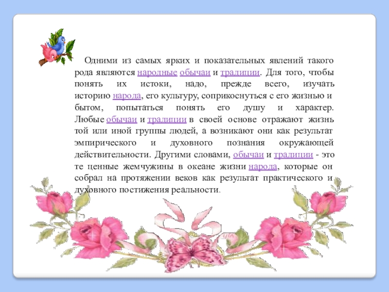 Слайд 3Одними из самых ярких и показательных явлений такого рода являются народные обычаи и традиции. Для