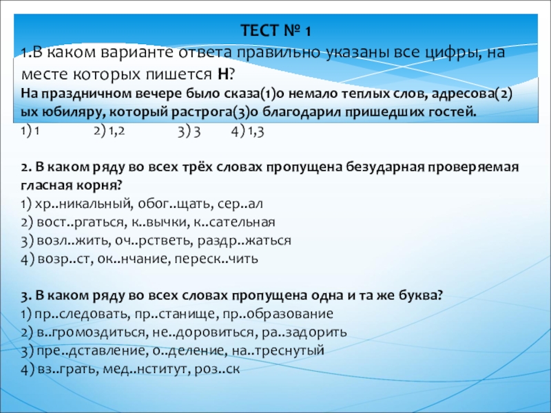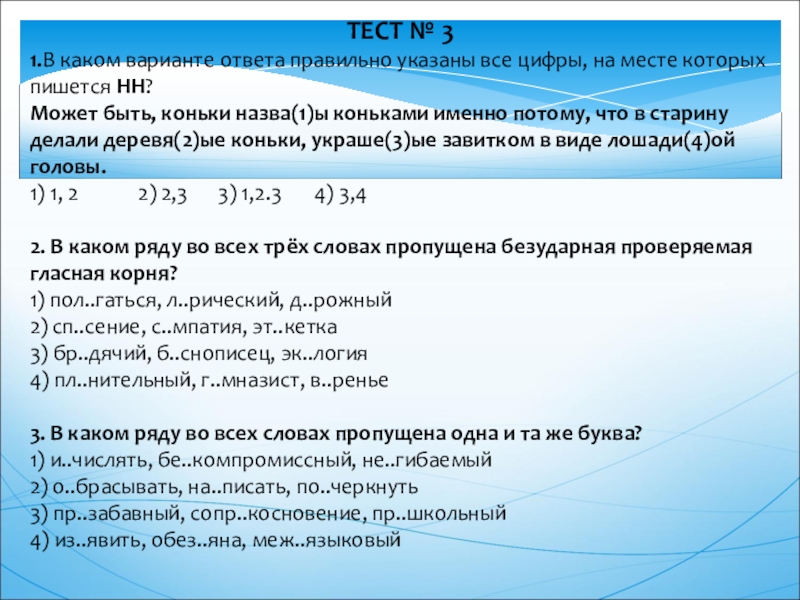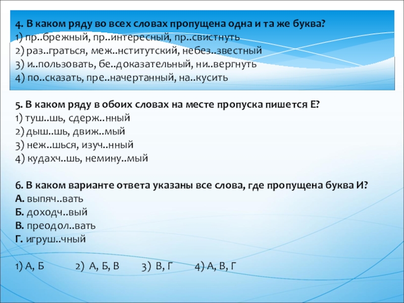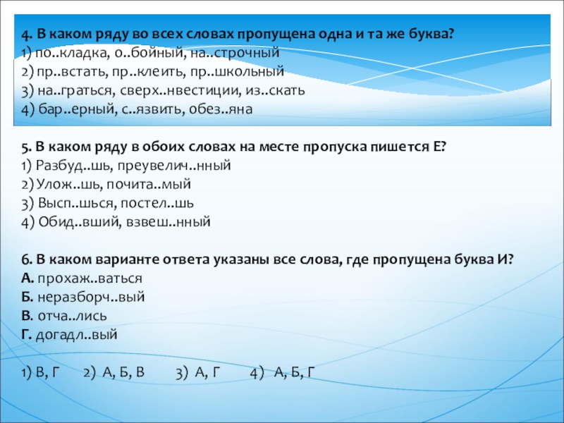 Слайд 134. В каком ряду во всех словах пропущена одна и та