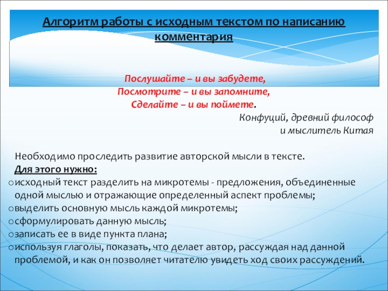 Слайд 28Алгоритм работы с исходным текстом по написанию комментария