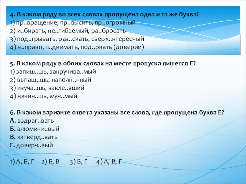 3. В каком ряду во всех словах пропущена одна и та же буква?
