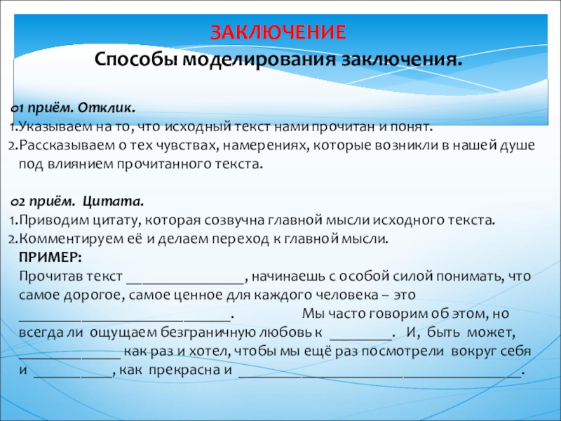 Прочитав текст _______________, начинаешь с особой силой понимать, что самое дорогое, самое ценное для каждого человека – это ___________________________. Мы часто говорим об этом, но всегда ли ощущаем безграничную любовь к ________. И, быть может, _____________ как раз и хотел, чтобы мы ещё раз посмотрели вокруг себя и __________, как прекрасна и ____________________________________.