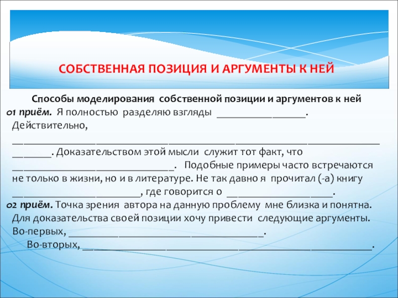 2 приём. Точка зрения автора на данную проблему мне близка и понятна. Для доказательства своей позиции хочу привести следующие аргументы. Во-первых, ___________________________________.