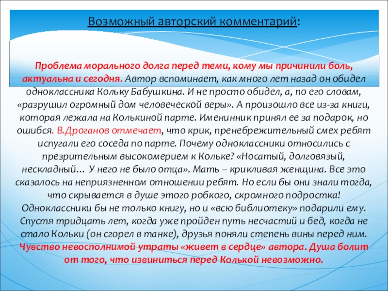 актуальна и сегодня. Автор вспоминает, как много лет назад он обидел одноклассника Кольку Бабушкина. И не просто обидел, а, по его словам, «разрушил огромный дом человеческой веры». А произошло все из-за книги, которая лежала на Колькиной парте. Именинник принял ее за подарок, но ошибся. В.Дроганов отмечает, что крик, пренебрежительный смех ребят испугали его соседа по парте. Почему одноклассники относились с презрительным высокомерием к Кольке? «Носатый, долговязый, нескладный… У него не было отца». Мать – крикливая женщина. Все это сказалось на неприязненном отношении ребят. Но если бы они знали тогда, что скрывается в душе этого робкого, скромного подростка! Одноклассники бы не только книгу, но и «всю библиотеку» подарили ему. Спустя тридцать лет, когда уже пройден путь несчастий и бед, когда не стало Кольки (он сгорел в танке), друзья поняли степень вины перед ним. Чувство невосполнимой утраты «живет в сердце» автора. Душа болит от того, что извиниться перед Колькой невозможно.