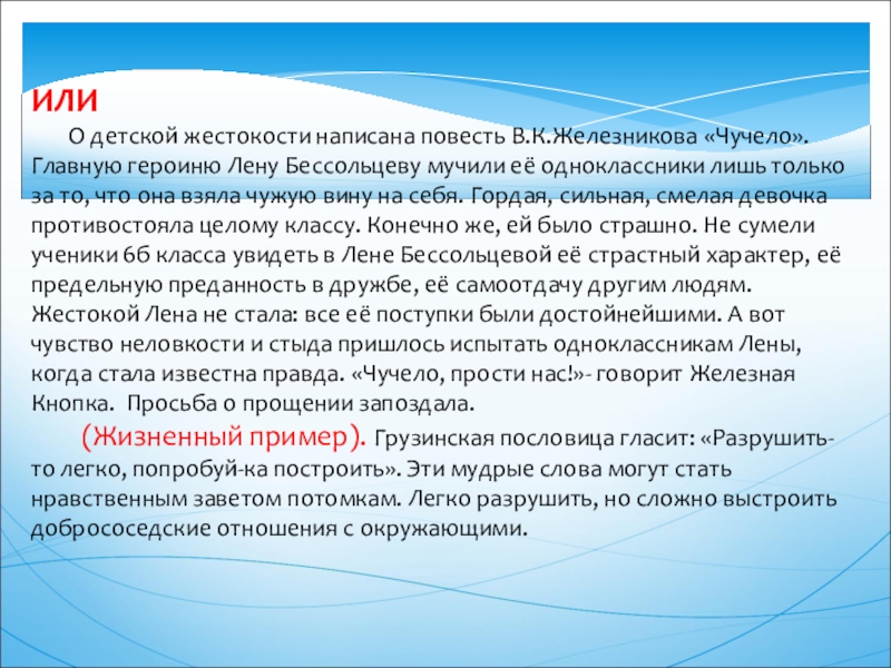 (Жизненный пример). Грузинская пословица гласит: «Разрушить-то легко, попробуй-ка построить». Эти мудрые слова могут стать нравственным заветом потомкам. Легко разрушить, но сложно выстроить добрососедские отношения с окружающими.