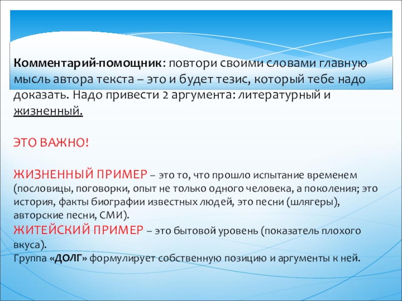 Слайд 34Комментарий-помощник: повтори своими словами главную мысль автора текста – это и