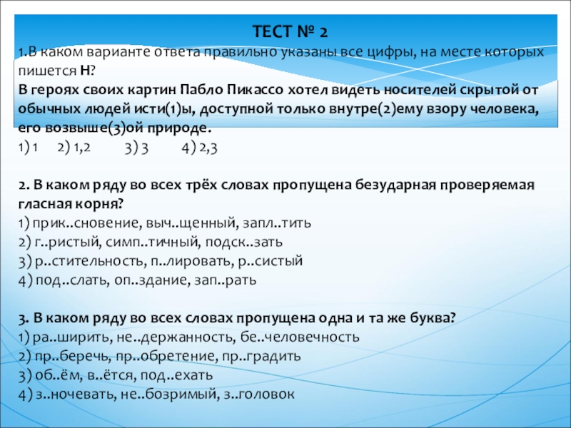 В героях своих картин Пабло Пикассо хотел видеть носителей скрытой от обычных людей исти(1)ы, доступной только внутре(2)ему взору человека, его возвыше(3)ой природе.