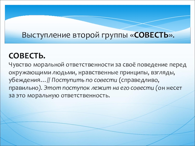 Слайд 8Выступление второй группы «СОВЕСТЬ».