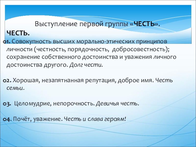 Слайд 7Выступление первой группы «ЧЕСТЬ».