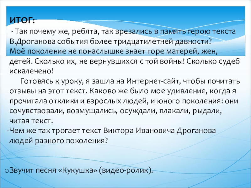 Готовясь к уроку, я зашла на Интернет-сайт, чтобы почитать отзывы на этот текст. Каково же было мое удивление, когда я прочитала отклики и взрослых людей, и юного поколения: они сочувствовали, возмущались, осуждали, плакали, рыдали, читая текст.