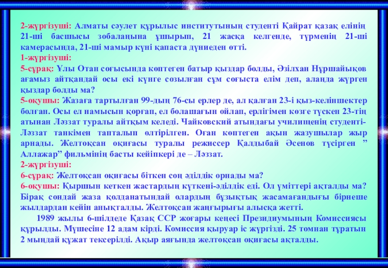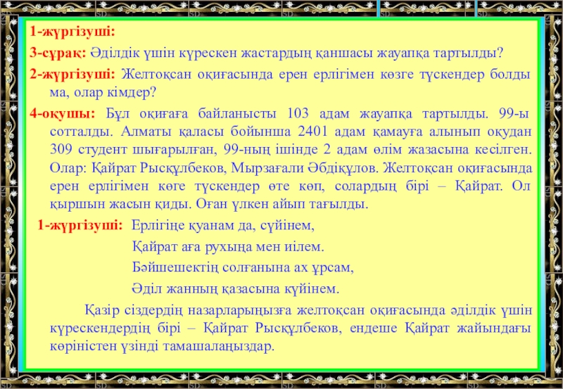 4-оқушы: Бұл оқиғаға байланысты 103 адам жауапқа тартылды. 99-ы сотталды. Алматы қаласы бойынша 2401 адам қамауға алынып оқудан 309 студент шығарылған, 99-ның ішінде 2 адам өлім жазасына кесілген. Олар: Қайрат Рысқұлбеков, Мырзағали Әбдіқұлов. Желтоқсан оқиғасында ерен ерлігімен көге түскендер өте көп, солардың бірі – Қайрат. Ол қыршын жасын қиды. Оған үлкен айып тағылды.