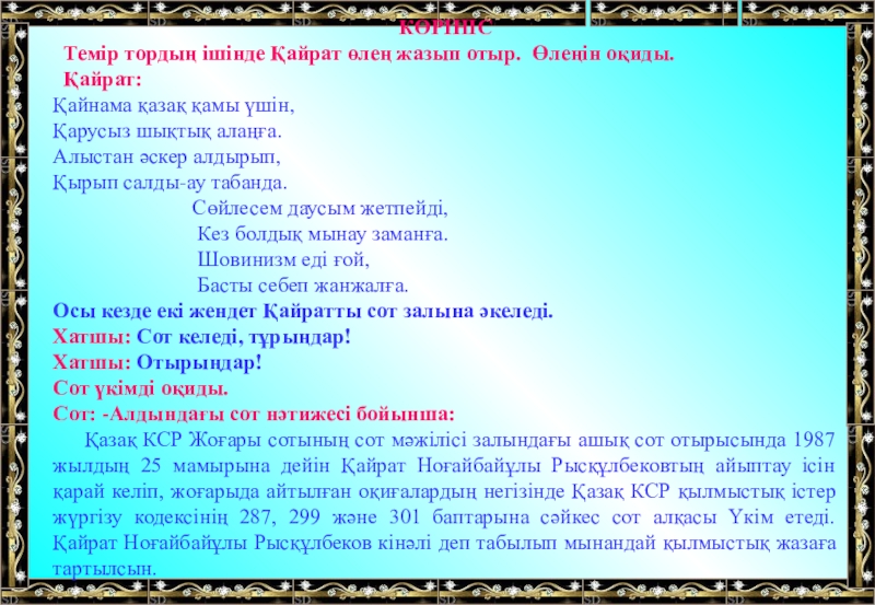 Қазақ КСР Жоғары сотының сот мәжілісі залындағы ашық сот отырысында 1987 жылдың 25 мамырына дейін Қайрат Ноғайбайұлы Рысқұлбековтың айыптау ісін қарай келіп, жоғарыда айтылған оқиғалардың негізінде Қазақ КСР қылмыстық істер жүргізу кодексінің 287, 299 және 301 баптарына сәйкес сот алқасы Үкім етеді. Қайрат Ноғайбайұлы Рысқұлбеков кінәлі деп табылып мынандай қылмыстық жазаға тартылсын.