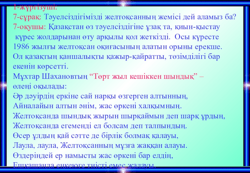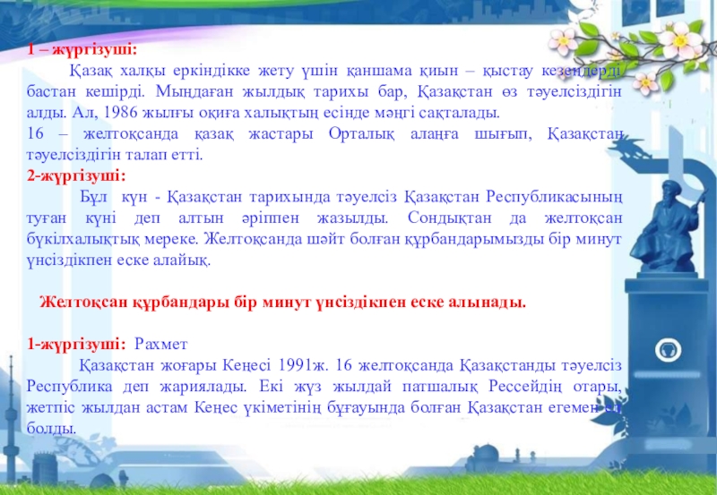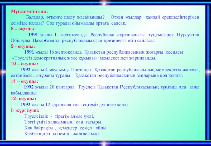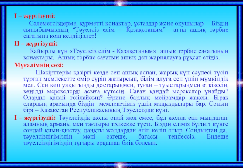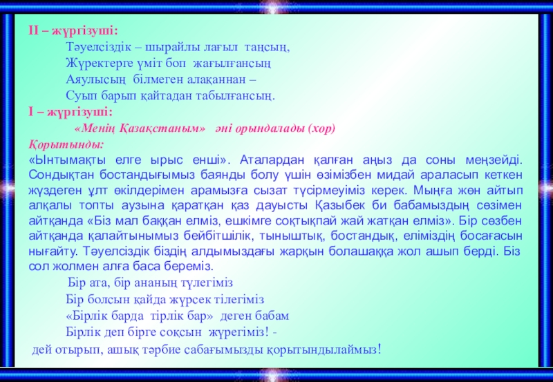 І - жүргізуші: Тәуелсіздік жолы оңай жол емес, бұл жолда сан мыңдаған адамның арманы мен тағдыры тәлкекке түсті. Біздің еліміз бүгінгі күнге сондай қиын-қыстау, даңқты жолдардан өтіп келіп отыр. Сондықтан да, тәуелсіздігіміздің мәні өзгеше, бағасы теңдессіз. Ендеше тәуелсіздігіміздің тұғыры әрқашан биік болсын.