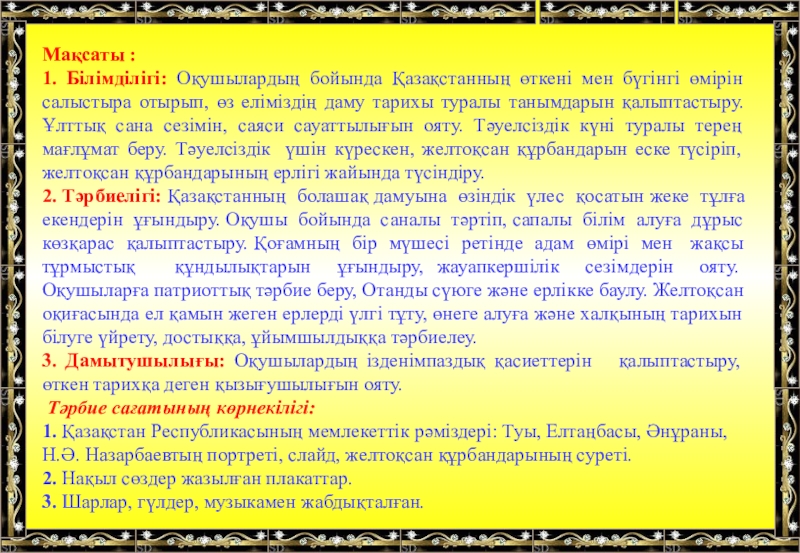 1. Білімділігі: Оқушылардың бойында Қазақстанның өткені мен бүгінгі өмірін