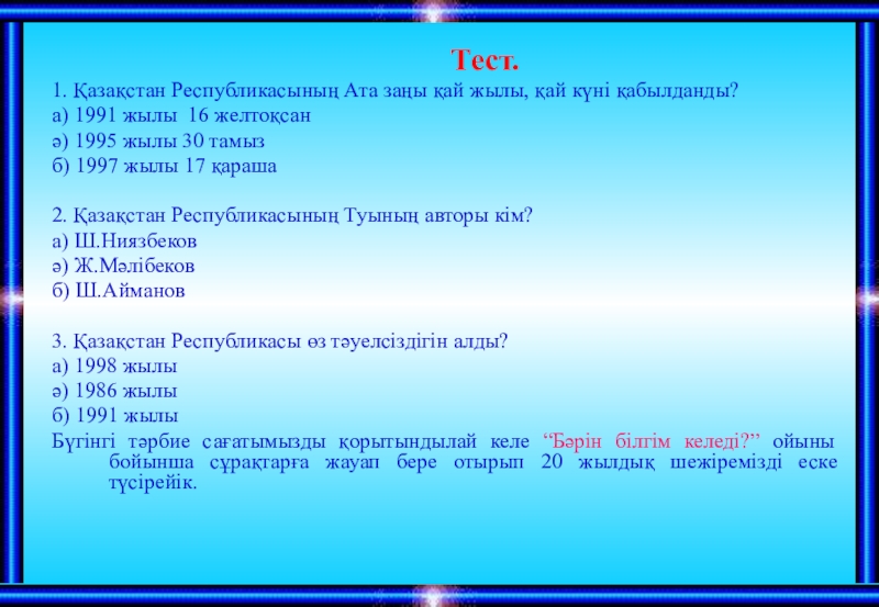 1. Қазақстан Республикасының Ата заңы қай жылы, қай күні қабылданды?