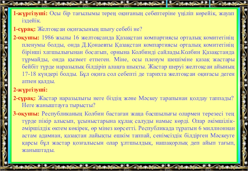 2-оқушы: 1986 жылы 16 желтоқсанда Қазақстан компартиясы орталық комитетінің пленумы болды, онда Д.Қонаевты Қазақстан компартиясы орталық комитетінің бірінші хатшылығынан босатып, орнына Колбинді сайлады.Колбин Қазақстанда тұрмайды, онда қызмет етпеген. Міне, осы пленум шешіміне қазақ жастары бейбіт түрде наразылық білдіріп алаңға шықты. Жастар шеруі желтоқсан айының 17-18 күндері болды. Бұл оқиға сол себепті де тарихта желтоқсан оқиғасы деген атпен қалды.