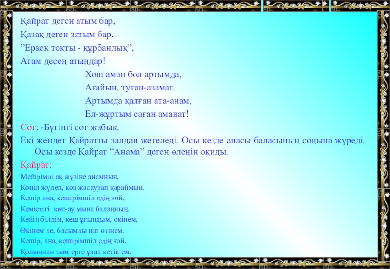 Екі жендет Қайратты залдан жетеледі. Осы кезде апасы баласының соңына жүреді. Осы кезде Қайрат “Анама” деген өлеңін оқиды.