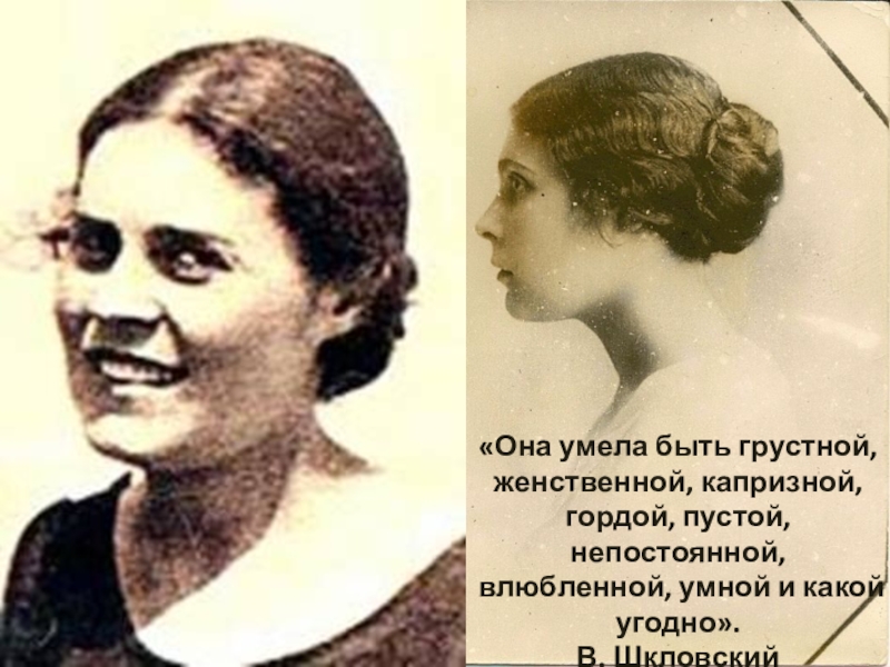 «Она умела быть грустной, женственной, капризной, гордой, пустой, непостоянной, влюбленной, умной и какой угодно».В. Шкловский