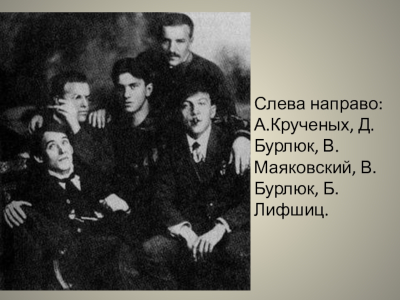 Слайд 3Слева направо: А.Крученых, Д.Бурлюк, В.Маяковский, В.Бурлюк, Б.Лифшиц.