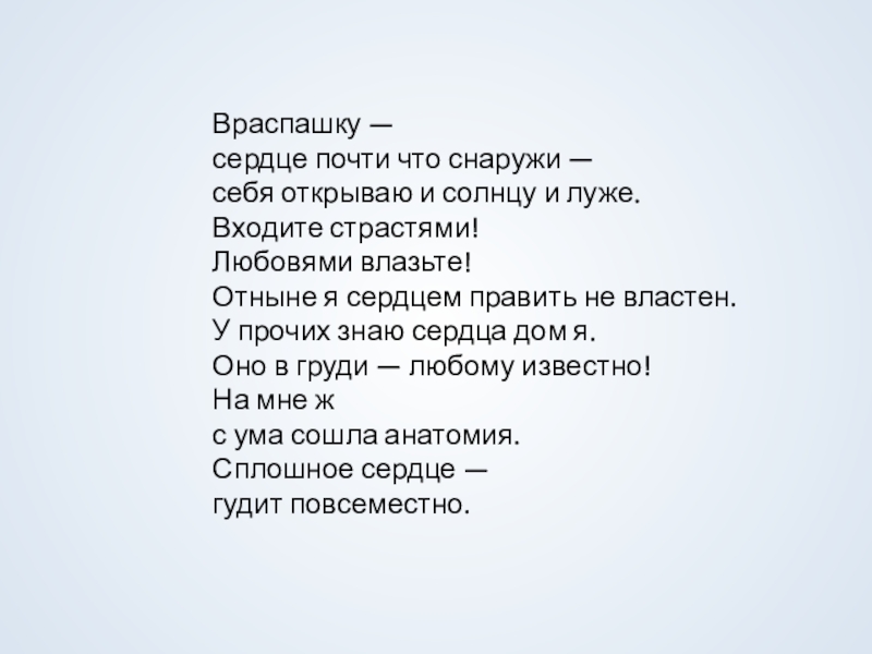 Враспашку — сердце почти что снаружи — себя открываю и солнцу и луже. Входите страстями! Любовями