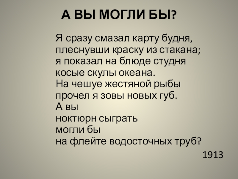 показал на блюде студня косые скулы океана. На чешуе жестяной рыбы прочел я зовы новых губ. А вы ноктюрн сыграть могли бы на флейте водосточных труб?