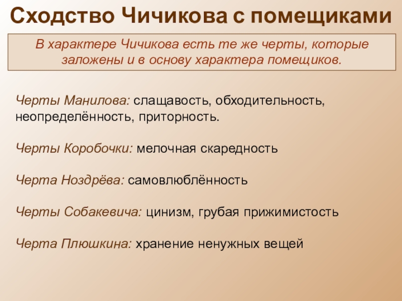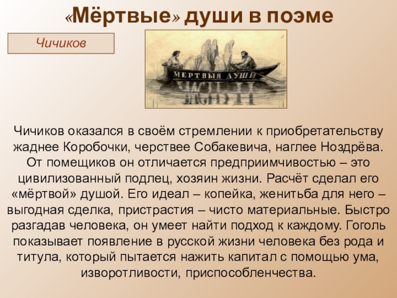 Коробочки, черствее Собакевича, наглее Ноздрёва. От помещиков он отличается предприимчивостью – это цивилизованный подлец, хозяин жизни. Расчёт сделал его «мёртвой» душой. Его идеал – копейка, женитьба для него – выгодная сделка, пристрастия – чисто материальные. Быстро разгадав человека, он умеет найти подход к каждому. Гоголь показывает появление в русской жизни человека без рода и титула, который пытается нажить капитал с помощью ума, изворотливости, приспособленчества.