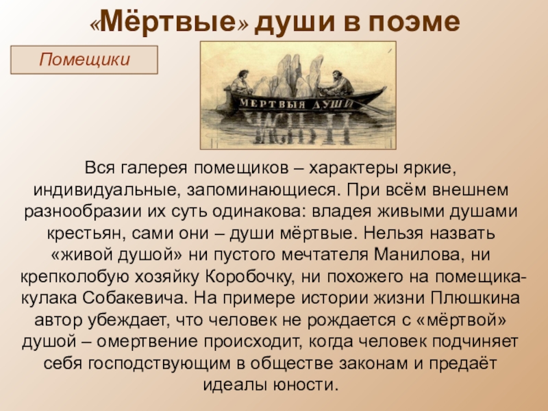 При всём внешнем разнообразии их суть одинакова: владея живыми душами крестьян, сами они – души мёртвые. Нельзя назвать «живой душой» ни пустого мечтателя Манилова, ни крепколобую хозяйку Коробочку, ни похожего на помещика-кулака Собакевича. На примере истории жизни Плюшкина автор убеждает, что человек не рождается с «мёртвой» душой – омертвение происходит, когда человек подчиняет себя господствующим в обществе законам и предаёт идеалы юности.