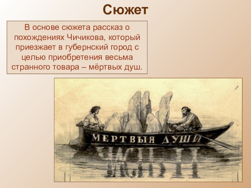 В основе сюжета рассказ о похождениях Чичикова, который приезжает в губернский