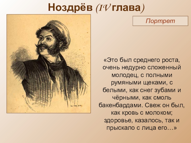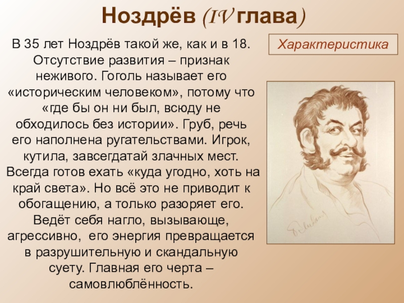 18. Отсутствие развития – признак неживого. Гоголь называет его «историческим человеком», потому что «где бы он ни был, всюду не обходилось без истории». Груб, речь его наполнена ругательствами. Игрок, кутила, завсегдатай злачных мест. Всегда готов ехать «куда угодно, хоть на край света». Но всё это не приводит к обогащению, а только разоряет его. Ведёт себя нагло, вызывающе, агрессивно, его энергия превращается в разрушительную и скандальную суету. Главная его черта – самовлюблённость.