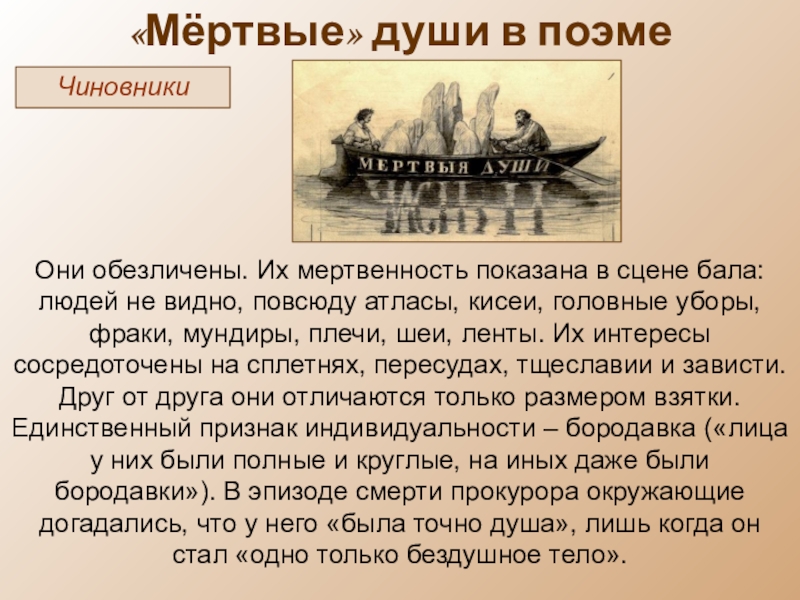 все эти Ноздрёвы, Маниловы и все прочие – вот мёртвые души, и мы их встречаем на каждом шагу». «Мёртвые души» обозначают в данном случае мертвенность, бездуховность.