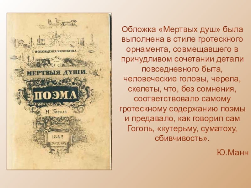 Слайд 3Обложка «Мертвых душ» была выполнена в стиле гротескного орнамента, совмещавшего в