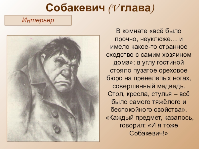 странное сходство с самим хозяином дома»; в углу гостиной стояло пузатое ореховое бюро на пренелепых ногах, совершенный медведь. Стол, кресла, стулья – всё было самого тяжёлого и беспокойного свойства». «Каждый предмет, казалось, говорил: «И я тоже Собакевич!»