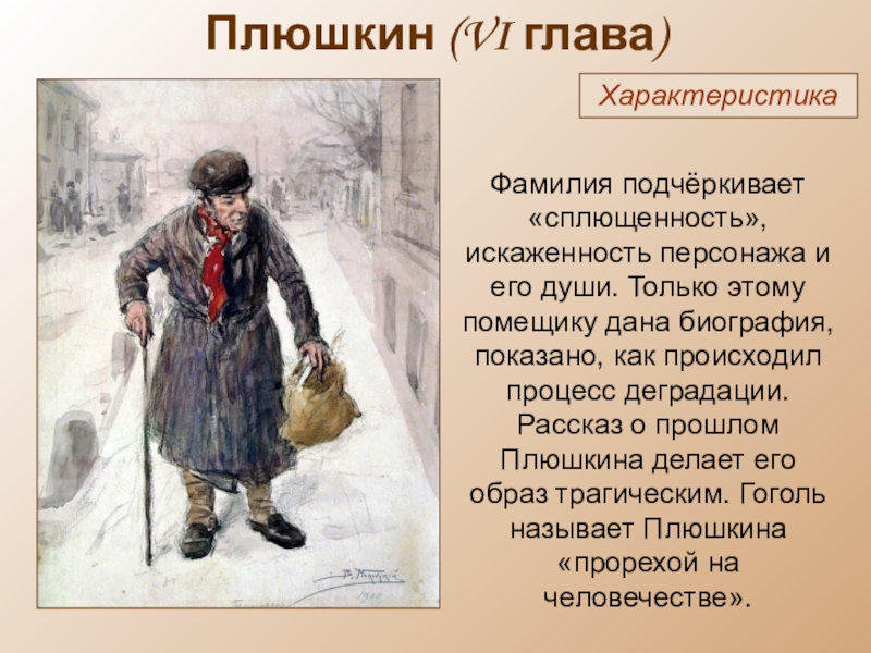 этому помещику дана биография, показано, как происходил процесс деградации. Рассказ о прошлом Плюшкина делает его образ трагическим. Гоголь называет Плюшкина «прорехой на человечестве».