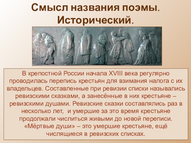 перепись крестьян для взимания налога с их владельцев. Составленные при ревизии списки назывались ревизскими сказками, а занесённые в них крестьяне – ревизскими душами. Ревизские сказки составлялись раз в несколько лет, и умершие за это время крестьяне продолжали числиться живыми до новой переписи. «Мёртвые души» – это умершие крестьяне, ещё числящиеся в ревизских списках.