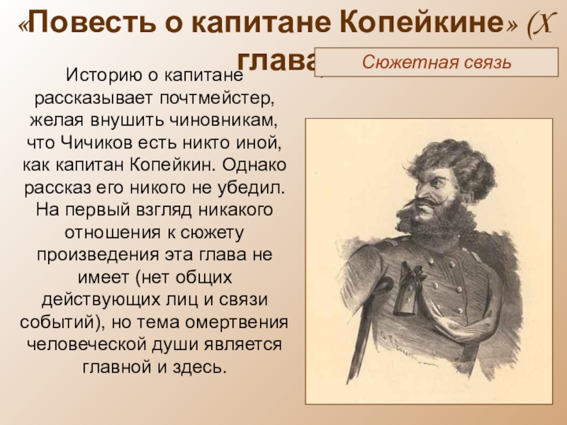 желая внушить чиновникам, что Чичиков есть никто иной, как капитан Копейкин. Однако рассказ его никого не убедил. На первый взгляд никакого отношения к сюжету произведения эта глава не имеет (нет общих действующих лиц и связи событий), но тема омертвения человеческой души является главной и здесь.