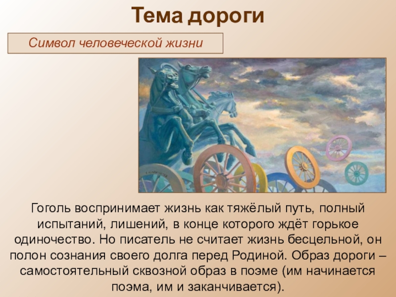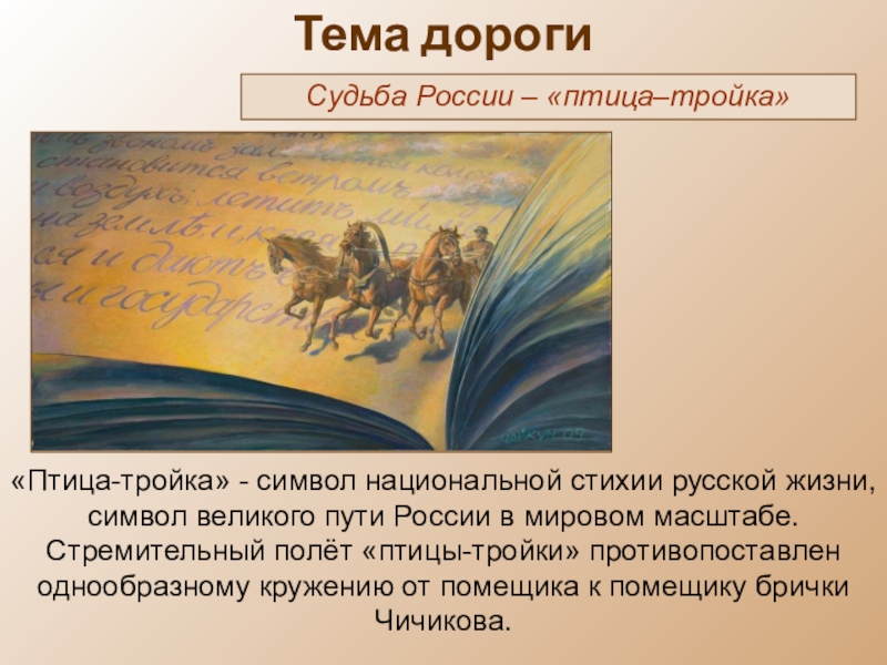 символ великого пути России в мировом масштабе. Стремительный полёт «птицы-тройки» противопоставлен однообразному кружению от помещика к помещику брички Чичикова.