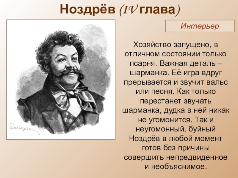 – шарманка. Её игра вдруг прерывается и звучит вальс или песня. Как только перестанет звучать шарманка, дудка в ней никак не угомонится. Так и неугомонный, буйный Ноздрёв в любой момент готов без причины совершить непредвиденное и необъяснимое.