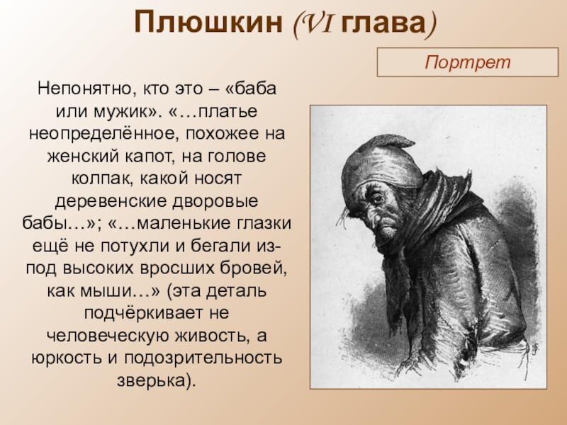 похожее на женский капот, на голове колпак, какой носят деревенские дворовые бабы…»; «…маленькие глазки ещё не потухли и бегали из-под высоких вросших бровей, как мыши…» (эта деталь подчёркивает не человеческую живость, а юркость и подозрительность зверька).