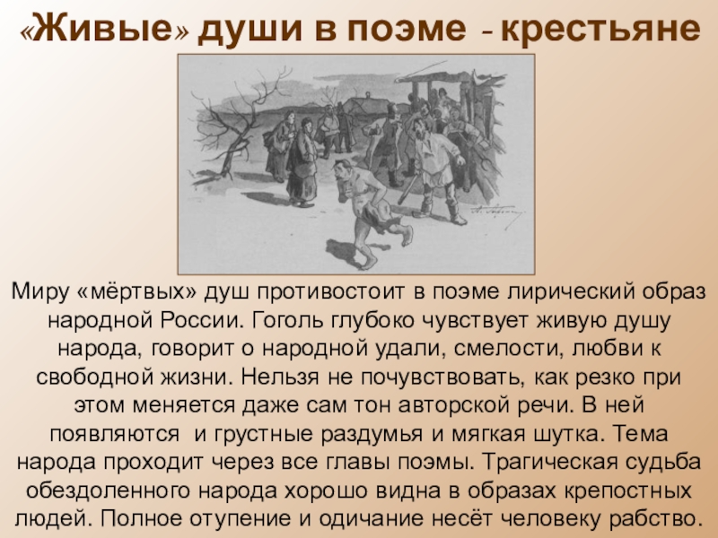 стоят реальные крестьяне, конкретные люди со своими яркими характерами, которых помещик властен продать или купить. Символикой заглавия задано противопоставление мёртвого и живого.