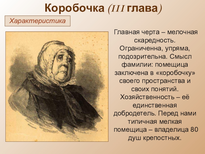 фамилии: помещица заключена в «коробочку» своего пространства и своих понятий. Хозяйственность – её единственная добродетель. Перед нами типичная мелкая помещица – владелица 80 душ крепостных.