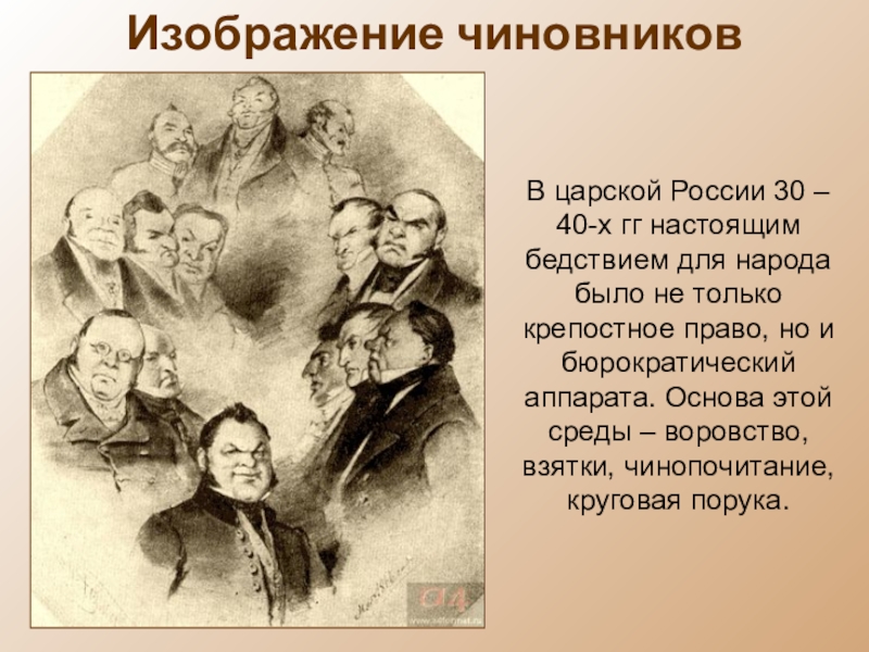 народа было не только крепостное право, но и бюрократический аппарата. Основа этой среды – воровство, взятки, чинопочитание, круговая порука.