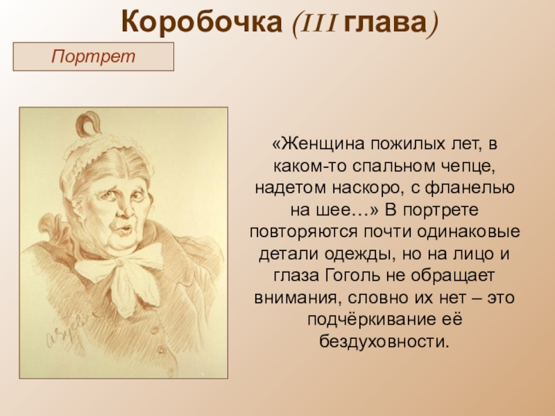 с фланелью на шее…» В портрете повторяются почти одинаковые детали одежды, но на лицо и глаза Гоголь не обращает внимания, словно их нет – это подчёркивание её бездуховности.