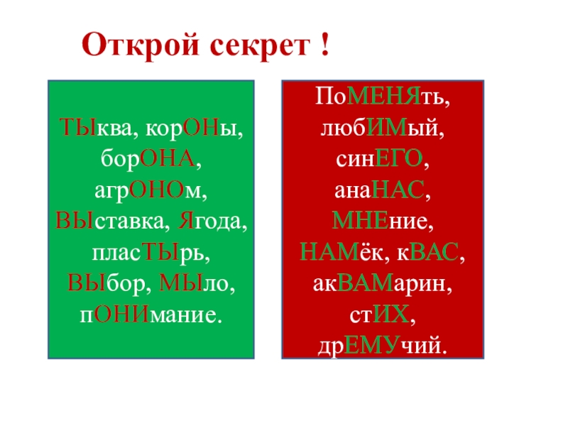 Слайд 25ТЫква, корОНы, борОНА, агрОНОм, ВЫставка, Ягода, пласТЫрь, ВЫбор, МЫло, пОНИмание.