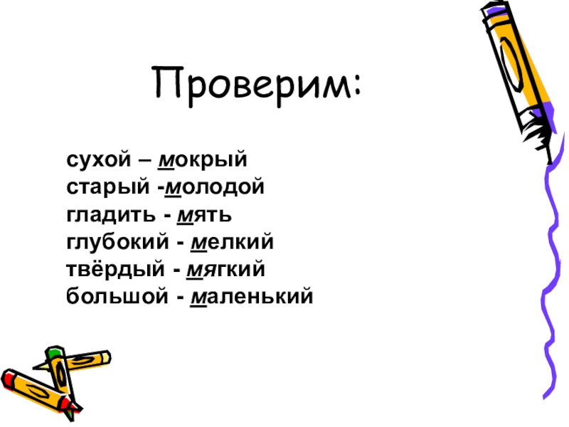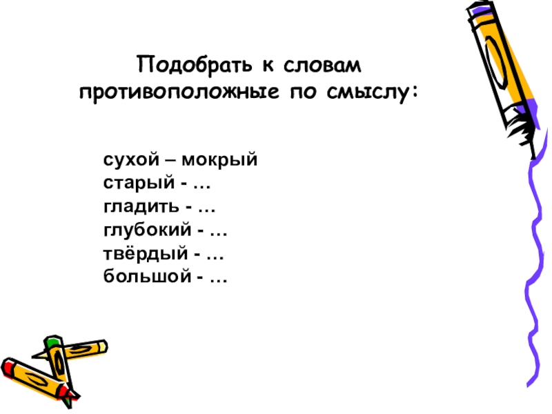 Слайд 8Подобрать к словам противоположные по смыслу: