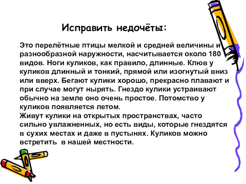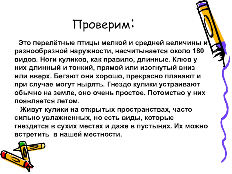насчитывается около 180 видов. Ноги куликов, как правило, длинные. Клюв у куликов длинный и тонкий, прямой или изогнутый вниз или вверх. Бегают кулики хорошо, прекрасно плавают и при случае могут нырять. Гнездо кулики устраивают обычно на земле оно очень простое. Потомство у куликов появляется летом.