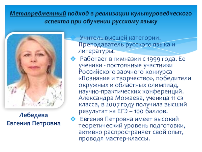 Евгения Петровна имеет высокий теоретический уровень подготовки, активно распространяет свой опыт, проводя мастер-классы.