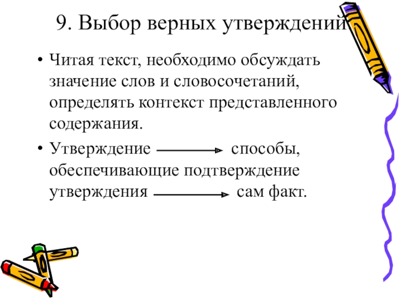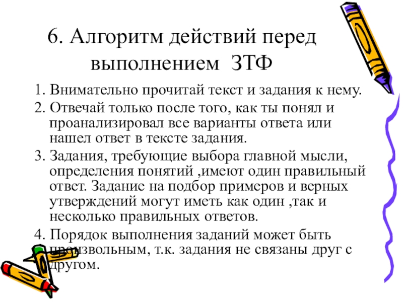 3. Задания, требующие выбора главной мысли, определения понятий ,имеют один правильный ответ. Задание на подбор примеров и верных утверждений могут иметь как один ,так и несколько правильных ответов.